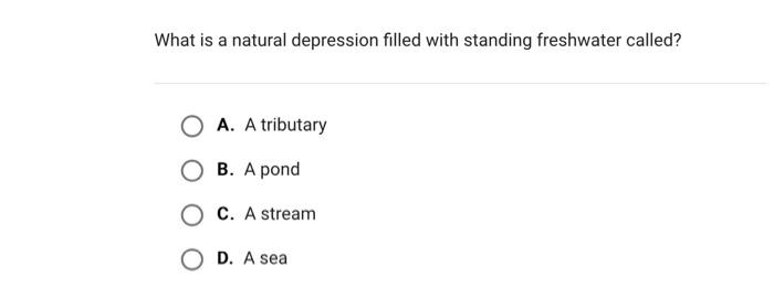 What Is A Natural Depression Filled With Standing Freshwater Called Please Help Brainly Com